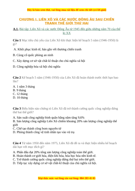 Câu 1 Mục tiêu chủ yếu của Liên Xô khi thực hiện kế hoạch 5 năm (1946-1950) là