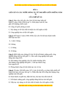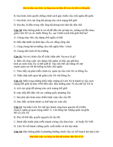 ủ Liên Xô đã hoàn thành trư c ớ th i ờ h n bao ạ lâu? A. 1 năm 3 tháng B. 9 tháng C. 12 tháng D. 10 tháng Câu 3: Bi u ể hi n nào ch ệ ng t ứ L ỏ iên Xô đã tr t ở hành cư ng qu ờ c công ố nghiệp đ ng t ứ h hai ứ th gi ế i ớ ? A. S n ả xu t ấ công nghi p bì ệ nh quân h ng năm ằ tăng 9,6% B. S n l ả ư ng công ợ nghi p L ệ iên Xô chi m ế kho ng ả 20% s n l ả ư ng ợ công nghi p t ệ hế gi i ớ C. Chế t o t ạ hành công bom nguyên tử D. Phóng thành công v t ệ inh nhân t o vào vũ t ạ rụ Câu 4: T năm ừ 1950 đ n năm ế 1975, Liên Xô đã đ r ề a và th c hi ự n nhi ệ u k ề ế ho ch dài ạ h n v ạ i ớ m c đí ụ ch gì? A. Ph n đ ấ u đ ấ t ạ 20% t ng s ổ n ả lư ng công ợ nghiệp toàn th gi ế i ớ . B. Hoàn thành c gi ơ i ớ hóa, đi n khí ệ hóa, hóa h c hóa n ọ n ki ề nh t . ế C. Tr t ở hành cư ng qu ờ ốc công nghi p đ ệ ng t ứ h hai ứ trên th gi ế i ớ . D. Ti p t ế c xây d ụ ng ự c s ơ ở v t ậ ch t ấ -kĩ thu t ậ c a ch ủ ủ nghĩa xã h i ộ . M i