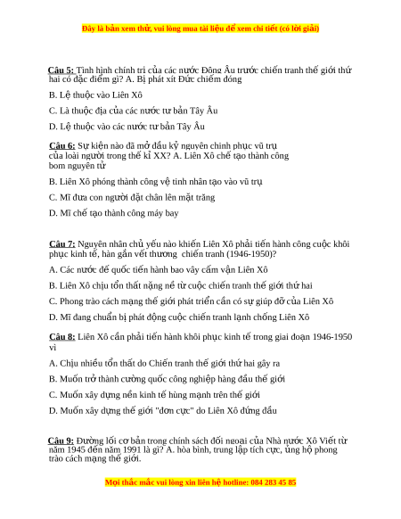 ể gì? A. Bị phát xít Đ c chi ứ m ế đóng B. L t ệ hu c vào ộ Liên Xô C. Là thu c ộ đ a ị c a các ủ nư c t ớ b ư n ả Tây Âu D. Lệ thu c ộ vào các nư c ớ t b ư n ả Tây Âu Câu 6: S ki