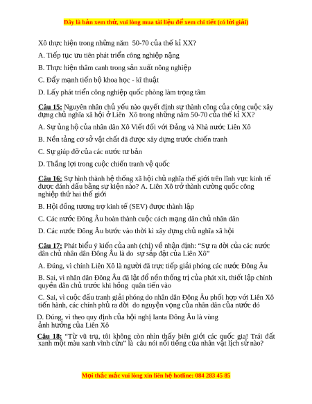 Câu 15: Nguyên nhân ch y ủ u nào quy ế t ế đ nh s ị ự thành công c a ủ công cu c xây ộ d ng ch ự nghĩ ủ a xã h i ộ L ở iên Xô trong nh ng năm ữ 50-70 c a t ủ h k ế X ỉ X? A. S ự ng h ủ c ộ a ủ nhân dân Xô Vi t ế đối v i ớ Đ ng ả và Nhà nư c ớ Liên Xô B. N n t ề ng c ả ơ sở v t ậ ch t ấ đã đư c ợ xây d ng t ự rư c ớ chi n t ế ranh C. S gi ự úp đ c ỡ a các ủ nư c t ớ ư b n ả D. Th ng l ắ i ợ trong cu c ộ chi n t ế ranh v qu ệ c ố Câu 16: S hì ự nh thành h t ệ hống xã h i ộ ch nghĩ ủ a thế gi i ớ trên lĩnh v c ki ự nh t ế đư c đánh ợ d u b ấ ng ằ s ki ự n nào? ệ A. Liên Xô tr t ở hành cư ng ờ qu c công ố nghiệp thứ hai th gi ế i ớ B. H i ộ đ ng t ồ ư ng t ơ rợ kinh t ( ế SEV) đư c ợ thành l p ậ