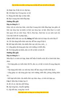 D. Địa lí mang tính ch t ấ t ng h ổ p. ợ Hư ng d ớ ẫn gi i ả Đáp án đúng là: D Khác v i ớ các môn h c ọ khác, môn Đ a ị lí mang tính ch t ấ t ng ổ h p, ợ bao g m ồ cả lĩnh v c ự khoa h c ọ tự nhiên và lĩnh v c ự khoa h c ọ xã h i ộ . Môn Đ a ị lí có m i ố liên quan v i ớ các môn Toán, V t ậ lí, Hoá h c, ọ Sinh h c ọ và các môn L ch ị s , ử Giáo d c ụ kinh t và pháp l ế u t ậ ,... Câu 4. Bi u ể hi n nào s ệ au đây không th hi ể n t ệ ính tích h p c ợ a ủ môn Đ a ị lí? A. Chỉ v n ậ d ng ki ụ n t ế h c m ứ ôn h c ọ đ l ể àm sáng t đ ỏ a l ị í. B. K t ế h p ki ợ n t ế h c ứ c a nhi ủ u l ề ĩnh v c ( ự s , ử hóa, sinh,…). C. L ng ghép ồ n i ộ dung giáo d c m ụ ôi trư ng và bi ờ n đ ể o. ả D. Tích h p gi ợ a t ữ nhi ự ên, dân c v ư i ớ xã h i ộ và kinh t . ế Hư ng d ớ ẫn gi i ả Đáp án đúng là: A Môn Đ a ị lí có tính tích h p, ợ đư c ợ th ể hi n ệ ở nhi u ề m c ứ đ ộ và hình th c ứ khác nhau. - Tích h p ợ gi a ữ các ki n ế th c ứ ĐLTN, dân c , ư xã h i ộ và kinh t ế trong t ng ừ bài h c. ọ - V n ậ d ng ki ụ n t ế h c các ứ môn h c khác ọ đ l ể àm sáng rõ ki n t ế h c đ ứ a l ị í. - L ng ồ ghép các n i ộ dung giáo d c ụ môi trư ng, ờ bi n ể đ o, ả phòng ch ng ố thiên tai,… - K t ế h p ki ợ n t ế h c ứ c a nhi ủ u l ề ĩnh v c khác ự