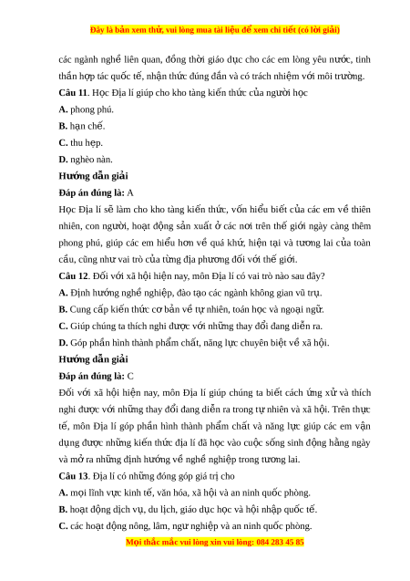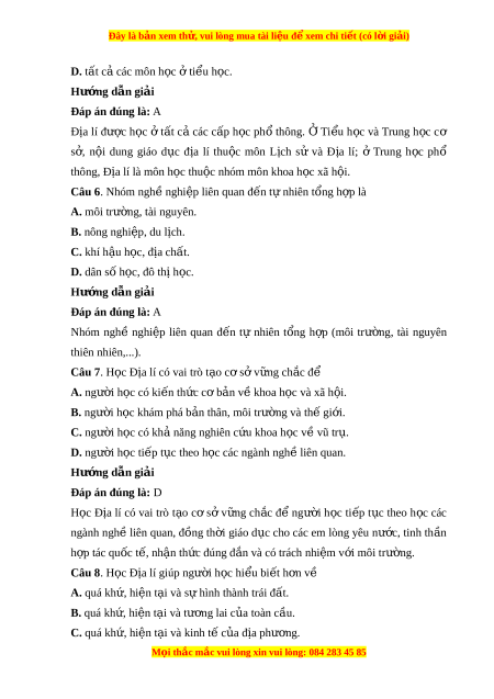 Đây là bản xem th , vu ử i lòng mua tài li u ệ đ xe ể m chi ti t ế (có l i ờ gi i ả ) D. tất c các ả môn h c ọ t ở i u h ể c. ọ Hư ng ớ d n gi ẫ i ả Đáp án đúng là: A Địa lí đư c ợ h c ọ ở t t ấ c ả các c p ấ h c ọ ph ổ thông. Ở Ti u ể h c ọ và Trung h c ọ cơ s , ở n i ộ dung giáo d c ụ đ a ị lí thu c ộ môn L ch ị sử và Đ a ị lí; ở Trung h c ọ phổ