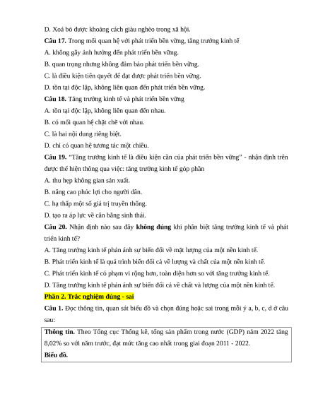 Câu 18. Tăng trưởng kinh tế và phát triển bền vững
