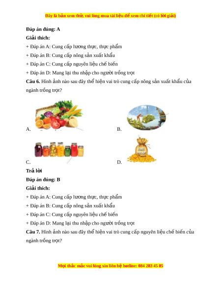 + Đáp án C: Cung c p nguyên l ấ i u ch ệ bi ế n ế + Đáp án D: Mang l i ạ thu nh p cho ng ậ ư i ờ tr ng t ồ r t ọ Câu 6. Hình nh ả nào sau đây th hi ể n vai ệ trò cung c p nông s ấ n xu ả t ấ kh u c ẩ a ủ ngành trồng tr t ọ ? A. B. C. D. Trả l i ờ Đáp án đúng: B Giải thích: + Đáp án A: Cung c p l ấ ư ng ơ th c, ự th c ph ự m ẩ