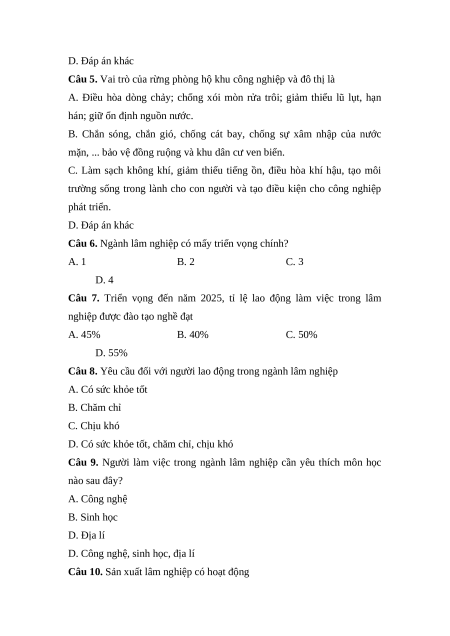 Câu 9. Người làm việc trong ngành lâm nghiệp cần yêu thích môn học nào sau đây? A. Công nghệ B. Sinh học D. Địa lí