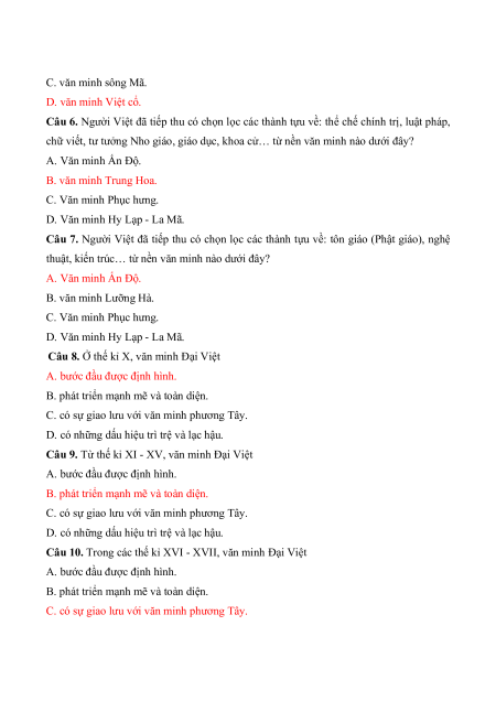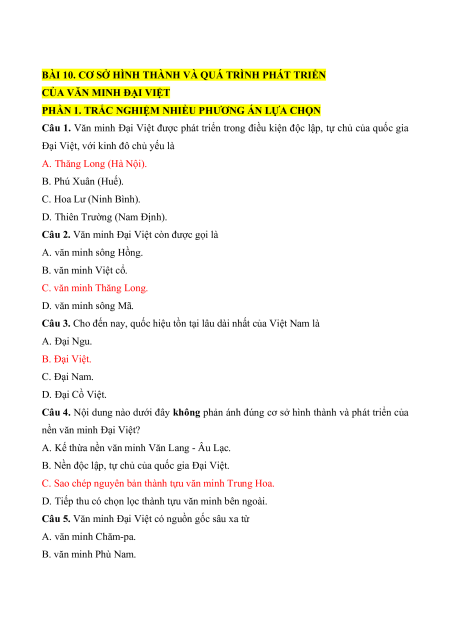 Câu 5. Văn minh Đại Việt có nguồn gốc sâu xa từ A. văn minh Chăm-pa. B. văn minh Phù Nam. C. văn minh sông Mã. D. văn minh Việt cổ.