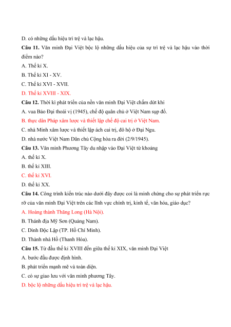 Câu 11. Văn minh Đại Việt bộc lộ những dấu hiệu của sự trì trệ và lạc hậu vào thời điểm nào? A. Thế kỉ X. B. Thế kỉ XI - XV. C. Thế kỉ XVI - XVII. D. Thế kỉ XVIII - XIX.