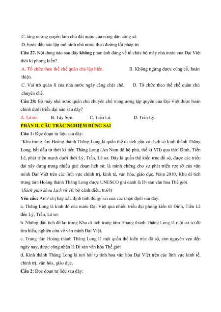 Câu 23. Từ thế kỉ XI-XV, văn minh Đại Việt phát triển mạnh mẽ và toàn diện gắn liền với các