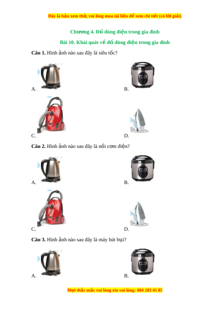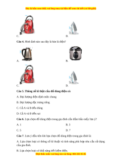 Đây là bản xem th , vu ử i lòng mua tài li u ệ đ xe ể m chi ti t ế (có l i ờ gi i ả ) C. D. Câu 4. Hình nh nào s ả au đây là bàn là đi n? ệ A. B. C. D. Câu 5. Thông s kĩ ố th t ậ c a đ ủ dù ồ ng đi n có: ệ A. Đ i ạ lư ng ợ đi n đ ệ nh m ị c chung ứ B. Đ i ạ lư ng đ ợ c ặ tr ng r ư iêng C. C ả A và B đ u ề đúng D. Cả A và B đ u s ề ai Câu 6. L a ự ch n đ ọ ồ dùng đi n t ệ rong gia đình c n đ ầ m ả b o ả m y l ấ u ư ý? A. 1 B. 3 C. 5 D. 7 Câu 7. L u ý đ ư ầu tiên khi l a ch ự n ọ đ dùng đi ồ n t ệ rong gia đình là: A. L a ự ch n ọ lo i ạ có thông số kĩ thu t ậ và tính năng phù h p ợ nhu c u ầ s ử d ng ụ c a gi ủ a đình. B. L a ch ự n l ọ o i ạ có kh năng ả ti t ế ki m ệ đi n. ệ M i