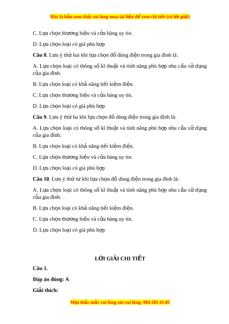 Đây là bản xem th , vu ử i lòng mua tài li u ệ đ xe ể m chi ti t ế (có l i ờ gi i ả ) C. L a ch ự n t ọ hư ng ơ hi u và c ệ a hàng uy t ử ín. D. L a ch ự n l ọ o i ạ có giá phù h p ợ Câu 8. L u ý t ư hứ hai khi l a ch ự n đ ọ dùng đi ồ n t ệ rong gia đình là: A. L a ự ch n ọ lo i ạ có thông số kĩ thu t ậ và tính năng phù h p ợ nhu c u ầ s ử d ng ụ c a gi ủ a đình. B. L a ch ự n l ọ o i ạ có kh năng ả ti t ế ki m ệ đi n. ệ C. L a ch ự n t ọ hư ng ơ hi u và c ệ a hàng uy t ử ín. D. L a ch ự n l ọ o i ạ có giá phù h p ợ Câu 9. L u ý t ư hứ ba khi l a ch ự n đ ọ ồ dùng đi n t ệ rong gia đình là: A. L a ự ch n ọ lo i ạ có thông số kĩ thu t ậ và tính năng phù h p ợ nhu c u ầ s ử d ng ụ c a gi ủ a đình. B. L a ch ự n l ọ o i ạ có kh năng ả ti t ế ki m ệ đi n. ệ C. L a ch ự n t ọ hư ng ơ hi u và c ệ a hàng uy t ử ín. D. L a ch ự n l ọ o i ạ có giá phù h p ợ Câu 10. L u ý t ư hứ t khi ư l a ch ự n đ ọ dùng đi ồ n t ệ rong gia đình là: A. L a ự ch n ọ lo i ạ có thông số kĩ thu t ậ và tính năng phù h p ợ nhu c u ầ s ử d ng ụ c a gi ủ a đình. B. L a ch ự n l ọ o i ạ có kh năng ả ti t ế ki m ệ đi n. ệ C. L a ch ự n t ọ hư ng ơ hi u và c ệ a hàng uy t ử ín. D. L a ch ự n l ọ o i ạ có giá phù h p ợ L I Ờ GIẢI CHI TI T Ế Câu 1. Đáp án đúng: A Giải thích: M i