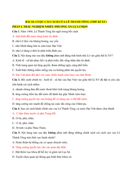Câu 2. Nội dung nào sau đây không phản ánh đúng tình hình nhà Lê vào giữa thế kỉ XV?