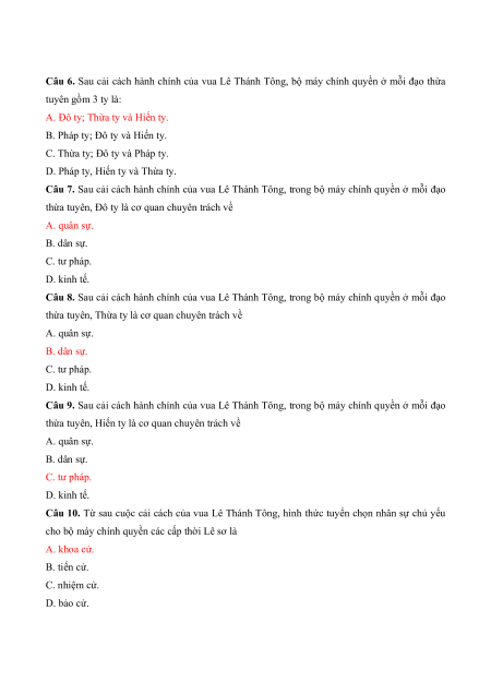 Câu 6. Sau cải cách hành chính của vua Lê Thánh Tông, bộ máy chính quyền ở mỗi đạo thừa tuyên gồm 3 ty là: