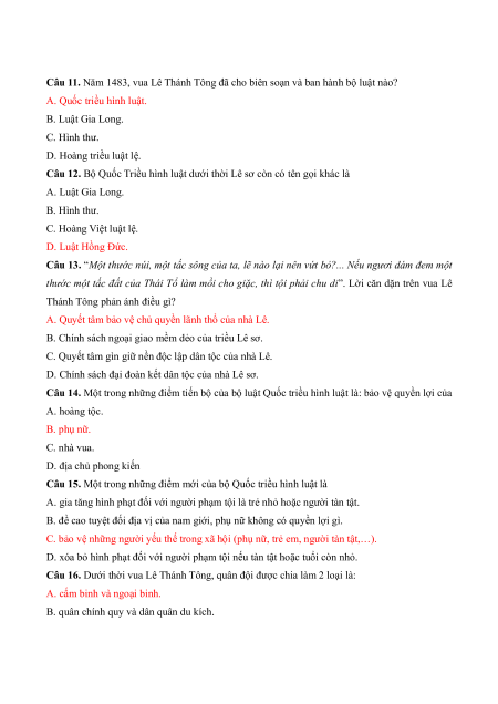 Câu 12. Bộ Quốc Triều hình luật dưới thời Lê sơ còn có tên gọi khác là A. Luật Gia Long. B. Hình thư. C. Hoàng Việt luật lệ. D. Luật Hồng Đức.