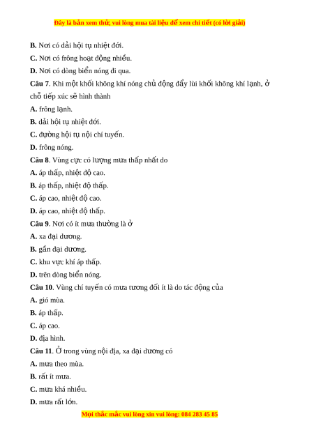 Đây là bản xem th , vu ử i lòng mua tài li u ệ đ xe ể m chi ti t (c ế ó l i ờ gi i ả ) B. N i ơ có d i ả h i ộ t nhi ụ t ệ đ i ớ . C. N i ơ có frông ho t ạ đ ng ộ nhi u. ề D. N i ơ có dòng bi n nóng đi ể qua. Câu 7. Khi m t ộ kh i ố không khí nóng ch ủ đ ng ộ đ y ẩ lùi kh i ố không khí l nh, ạ ở chỗ ti p xúc s ế ẽ hình thành A. frông l nh. ạ B. d i ả h i ộ t nhi ụ t ệ đ i ớ . C. đự ng ờ h i ộ t n ụ i ộ chí tuy n. ế D. frông nóng. Câu 8. Vùng c c có ự lư ng m ợ a t ư h p nh ấ t ấ do A. áp thấp, nhi t ệ đ cao. ộ B. áp thấp, nhi t ệ độ th p. ấ C. áp cao, nhi t ệ độ cao. D. áp cao, nhi t ệ độ th p. ấ Câu 9. N i ơ có ít m a t ư hư ng l ờ à ở A. xa đ i ạ dư ng. ơ B. gần đ i ạ dư ng. ơ C. khu v c ự khí áp th p. ấ