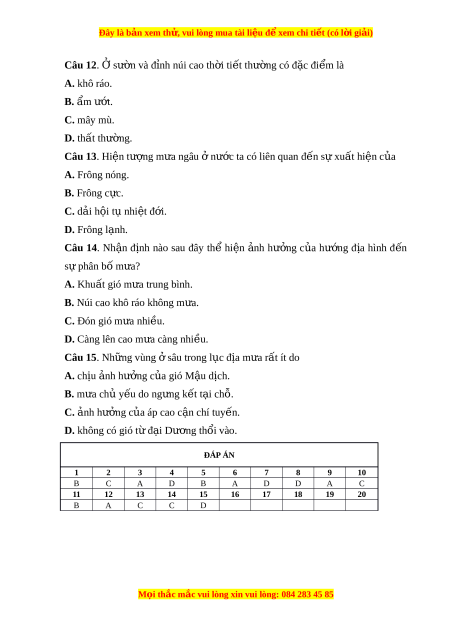 Đây là bản xem th , vu ử i lòng mua tài li u ệ đ xe ể m chi ti t ế (có l i ờ gi i ả ) Câu 12. Ở sư n và ờ đ nh núi ỉ cao th i ờ ti t ế thư ng có đ ờ c ặ đi m ể là A. khô ráo. B. ẩm ư t ớ . C. mây mù. D. thất thư ng. ờ Câu 13. Hi n t ệ ư ng m ợ a ngâu ư ở nư c t ớ a có liên quan đ n s ế xu ự t ấ hi n c ệ a ủ A. Frông nóng. B. Frông c c. ự C. d i ả h i ộ t nhi ụ t ệ đ i ớ . D. Frông l nh. ạ Câu 14. Nh n ậ đ nh ị nào sau đây thể hi n ệ nh ả hư ng ở c a ủ hư ng ớ đ a ị hình đ n ế s phân ự bố m a? ư A. Khuất gió m a ư trung bình.