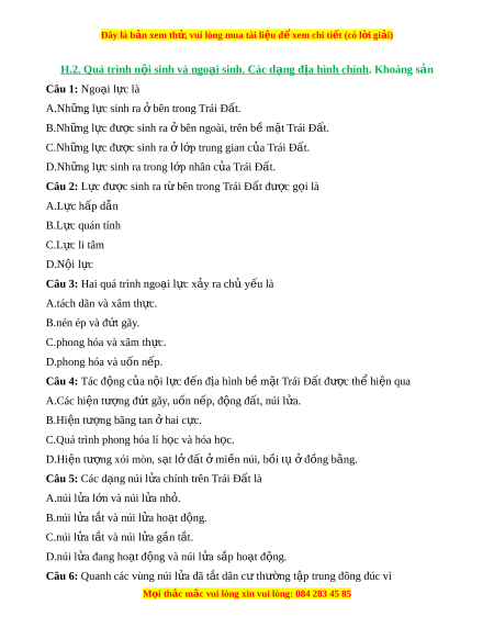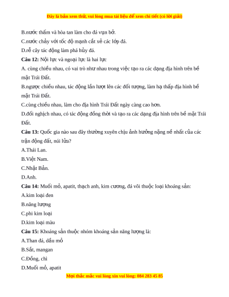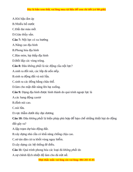 Đây là bản xem th , vu ử i lòng mua tài li u ệ đ xe ể m chi ti t (c ế ó l i ờ gi i ả ) A.Khí h u ậ m ấ áp B.Nhi u h ề ồ nư c ớ C.Đất đai màu m . ỡ D.Giàu th y ủ s n. ả Câu 7: N i ộ l c có xu h ự ư ng ớ A.Nâng cao đ a hì ị nh B.Phong hóa đ a hì ị nh