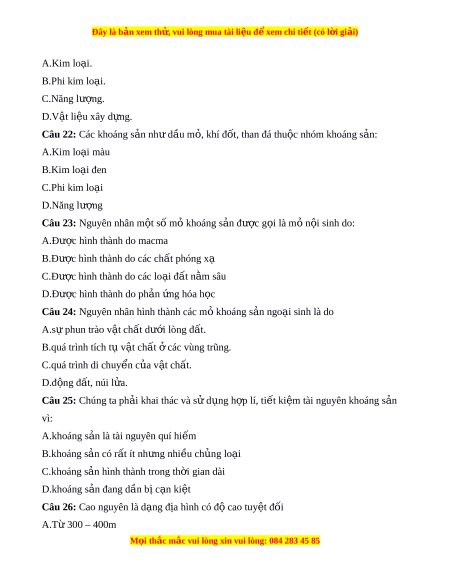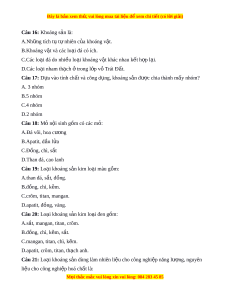 Đây là bản xem th , vu ử i lòng mua tài li u ệ đ xe ể m chi ti t (c ế ó l i ờ gi i ả ) Câu 16: Khoáng s n l ả à: A.Nh ng ữ tích t t ụ nhi ự ên c a khoáng v ủ t ậ . B.Khoáng v t ậ và các lo i ạ đá có ích. C.Các lo i ạ đá do nhi u l ề o i ạ khoáng v t ậ khác nhau k t ế h p l ợ i ạ . D.Các lo i ạ nham thạch t ở rong l p v ớ ỏ Trái Đ t ấ . Câu 17: D a vào t ự ính ch t ấ và công d ng, ụ khoáng s n ả đư c chi ợ a thành m y nhóm ấ ? A. 3 nhóm B.5 nhóm C.4 nhóm D.2 nhóm Câu 18: Mỏ n i ộ sinh gồm có các m : ỏ A.Đá vôi, hoa cư ng ơ B.Apatit, d u l ầ a ử C.Đồng, chì, s t ắ D.Than đá, cao lanh Câu 19: Lo i ạ khoáng s n ả kim lo i ạ màu g m ồ : A.than đá, s t ắ , đồng. B.đồng, chì, k m ẽ . C.crôm, titan, mangan. D.apatit, đồng, vàng. Câu 20: Lo i ạ khoáng s n ả kim lo i ạ đen g m ồ : A.s t ắ , mangan, titan, crôm. B.đồng, chì, k m ẽ , s t ắ . C.mangan, titan, chì, k m ẽ . D.apatit, crôm, titan, th ch ạ anh. Câu 21: Lo i ạ khoáng s n