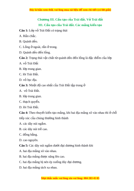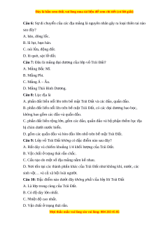 Đây là bản xem th , vu ử i lòng mua tài li u ệ đ xe ể m chi ti t ế (có l i ờ gi i ả ) Chư ng I ơ II. C u t ấ o c ạ a ủ Trái đ t ấ . V ỏ Trái đ t ấ H1. Cấu tạo c a ủ Trái đ t ấ . Các m ng ki ả n t ế o ạ Câu 1: L p v ớ ỏ Trái Đ t ấ có tr ng ạ thái A. R n ắ ch c. ắ B. Quánh d o. ẻ C. L ng ỏ ngoài ở , r n ắ ở trong. D. Quánh dẻo đ n l ế ng. ỏ Câu 2: Tr ng t ạ hái v t ậ chất t quánh d ừ o đ ẻ n l ế ng ỏ là đ c đi ặ m ể c a ủ l p ớ A. v ỏ Trái Đất B. l p t ớ rung gian. C. lõi Trái Đ t ấ . D. v l ỏ c đ ụ a. ị Câu 3: Nhi t ệ đ cao ộ nh t ấ c a ủ Trái Đ t ấ t p ậ trung ở A. v ỏ Trái Đất. B. l p t ớ rung gian. C. th ch ạ quy n. ể D. lõi Trái Đất. Câu 4: Theo thuy t ế ki n t ế o m ạ ng, ả khi hai đ a m ị ng xô vào nhau ả thì ch ở ỗ ti p xúc c ế a chúng ủ thư ng hì ờ nh thành A. các dãy núi ngầm. B. các dãy núi tr cao. ẻ C. đồng b ng. ằ D. cao nguyên.