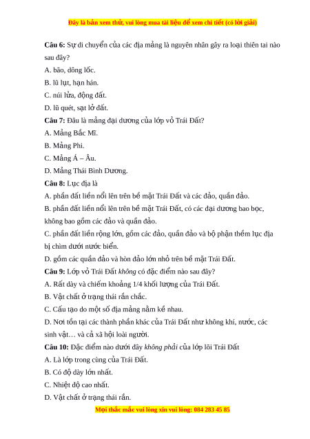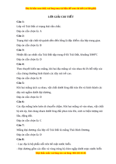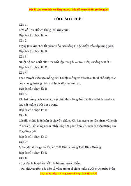Đây là bản xem th , vu ử i lòng mua tài li u ệ đ xe ể m chi ti t ế (có l i ờ gi i ả ) L I Ờ GIẢI CHI TI T Ế Câu 1: L p v ớ ỏ Trái Đất có tr ng t ạ hái r n ắ ch c. ắ Đáp án cần ch n ọ là: A Câu 2: Tr ng t ạ hái v t ậ ch t ấ t quánh d ừ o đ ẻ n l ế ng l ỏ à đ c ặ đi m ể c a l ủ p ớ trung gian. Đáp án cần ch n ọ là: B Câu 3: Nhi t ệ đ cao nh ộ t ấ c a ủ Trái Đ t ấ t p t ậ rung l ở õi Trái Đ t ấ , kho ng ả 50000C Đáp án cần ch n ọ là: D Câu 4: Theo thuy t ế ki n ế t o m ạ ng, khi ả hai đ a m ị ng ả xô vào nhau thì ch ở t ỗ i p xúc ế c a chúng t ủ hư ng