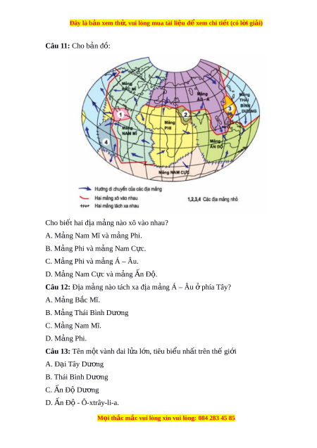 Đây là bản xem th , vu ử i lòng mua tài li u ệ đ xe ể m chi ti t ế (có l i ờ gi i ả ) Câu 11: Cho b n ả đồ: Cho bi t ế hai địa m ng ả nào xô vào nhau? A. M ng ả Nam Mĩ và m ng Phi ả . B. M ng Phi ả và m ng ả Nam C c. ự C. M ng Phi ả và m ng ả Á – Âu. D. M ng ả Nam C c ự và m ng ả n Đ Ấ . ộ Câu 12: Địa m ng ả nào tách xa đ a m ị ng ả Á – Âu phí ở a Tây? A. M ng ả B c ắ Mĩ. B. M ng ả Thái Bình Dư ng ơ C. M ng N ả am Mĩ. D. M ng ả Phi. Câu 13: Tên m t ộ vành đai l a ử l n, t ớ iêu bi u nh ể t ấ trên th gi ế i ớ A. Đ i ạ Tây Dư ng ơ B. Thái Bình Dư ng ơ C. n Đ Ấ ộ Dư ng ơ D. n Đ Ấ - ộ Ô-xtrây-li-a. M i
