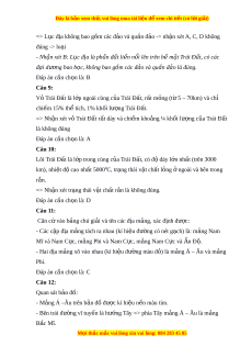 ấ phun trào lên, sinh ra hi n t ệ ư ng núi ợ l a, đ ử ng đ ộ ất. Đáp án cần ch n ọ là: C Câu 7: M ng ả đ i ạ dư ng ơ c a l ủ p v ớ ỏ Trái Đất là m ng ả Thái Bình Dư ng. ơ Đáp án cần ch n ọ là: D Câu 8: - L c đ ụ ịa là b ph ộ ẩn nổi trên bề m t ặ nư c ớ bi n. ể - Đ i ạ dư ng g ơ ồm các đ o ả và vùng trũng b chì ị m ng p ậ dư i ớ m c n ự ư c ớ bi n ể M i