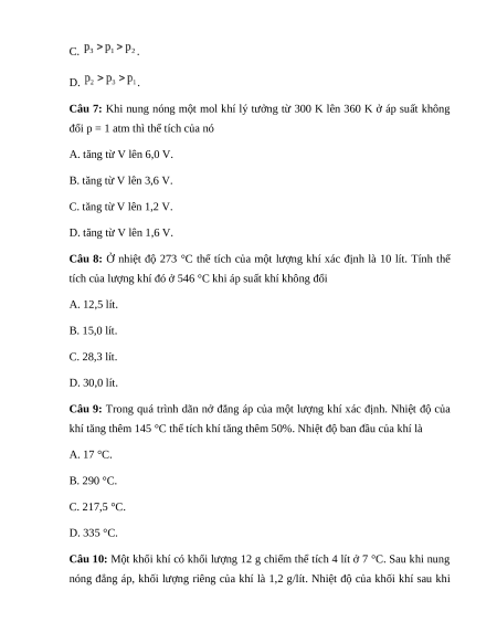 Câu 8: Ở nhiệt độ 273 °C thể tích của một lượng khí xác định là 10 lít. Tính thể