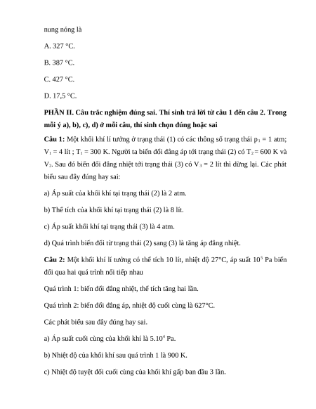 Câu 2: Một khối khí lí tưởng có thể tích 10 lít, nhiệt độ 27°C, áp suất 105 Pa biến