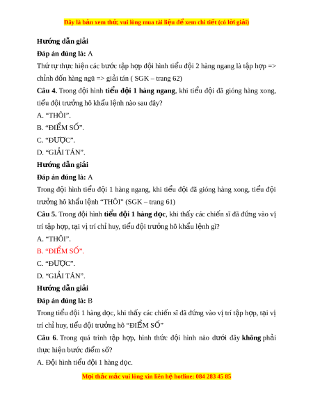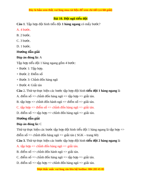 Đáp án đúng là: A T p h ậ p ợ ti u ể đ i ộ 1 hàng ngang g m ồ 4 bư c: ớ + Bư c 1: ớ T p h ậ p. ợ + Bư c 2: ớ Đi m ể số + Bư c 3: ớ Ch nh đ ỉ ốn hàng ngũ + Bư c 4: ớ Gi i ả tán Câu 2. Th t ứ t ự h c hi ự n các ệ bư c t ớ p ậ h p đ ợ i ộ hình ti u đ ể i ộ 1 hàng ngang là A. đi m ể số => ch nh đ ỉ n hàng ngũ => t ố p h ậ p ợ => gi i ả tán. B. t p h ậ p => ch ợ nh đ ỉ n hành ngũ => đi ố m ể s => gi ố i ả tán. C. t p h ậ p => đi ợ m ể s => ch ố nh đ ỉ n hàng ngũ => gi ố i ả tán. D. đi m ể số => t p ậ h p => ch ợ nh đ ỉ n hàng ố ngũ => gi i ả tán. Hư ng d ớ ẫn gi i ả Đáp án đúng là: C Th t ứ ự th c ự hi n các ệ bư c ớ t p ậ h p ợ đ i ộ hình ti u ể đ i ộ 1 hàng ngang là t p ậ h p => ợ đi m ể số => ch nh đ ỉ n hàng ngũ => gi ố i ả tán ( SGK – trang 60) Câu 3. Th t ứ t ự h c hi ự n các ệ bư c t ớ p ậ h p đ ợ i ộ hình ti u đ ể i ộ 2 hàng ngang là A. t p ậ h p => ch ợ nh đ ỉ n hàng ố ngũ => gi i ả tán. B. đi m ể s => ch ố nh đ ỉ n hành ngũ => gi ố i ả tán. C. đi m ể s => ch ố nh đ ỉ n hàng ngũ => t ố p ậ h p => gi ợ i ả tán. D. đi m ể số => t p ậ h p => ch ợ nh đ ỉ n hàng ố ngũ => gi i ả tán. M i