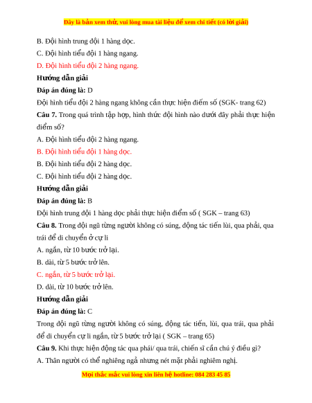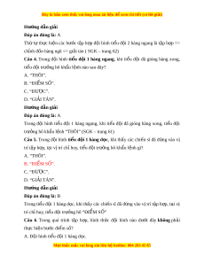 Câu 7. Trong quá trình t p ậ h p, ợ hình th c ứ đ i ộ hình nào dư i ớ đây ph i ả th c ự hi n ệ đi m ể số? A. Đ i ộ hình ti u ể đ i ộ 2 hàng ngang. B. Đ i ộ hình ti u đ ể i ộ 1 hàng d c. ọ B. Đ i ộ hình ti u đ ể i ộ 2 hàng d c. ọ C. Đ i ộ hình ti u đ ể i ộ 2 hàng d c. ọ Hư ng d ớ ẫn gi i ả Đáp án đúng là: B Đ i ộ hình trung đ i ộ 1 hàng d c ọ ph i ả th c hi ự n đi ệ m ể s ố ( SGK – trang 63) Câu 8. Trong đ i ộ ngũ t ng ừ ngư i ờ không có súng, đ ng ộ tác ti n ế lùi, qua ph i ả , qua trái đ di ể chuy n ể ở c l ự i A. ng n, ắ t 10 b ừ ư c ớ tr l ở i ạ . B. dài, t 5 b ừ ư c t ớ r l ở ên. C. ng n, t ắ 5 b ừ ư c ớ trở l i ạ . D. dài, từ 10 bư c t ớ r l ở ên. Hư ng d ớ ẫn gi i ả Đáp án đúng là: C Trong đ i ộ ngũ t ng ừ ngư i ờ không có súng, đ ng ộ tác ti n, ế lùi, qua trái, qua ph i ả đ di ể chuy n ể c l ự i ng n, t ắ 5 b ừ ước tr l ở i ạ ( SGK – trang 65) Câu 9. Khi th c ự hi n đ ệ ng