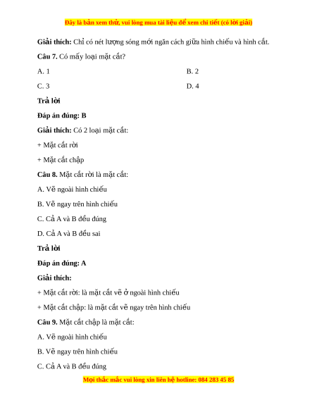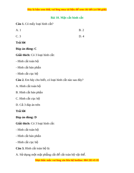 Đây là bản xem th , vu ử i lòng mua tài li u ệ đ xe ể m chi ti t (c ế ó l i ờ gi i ả ) Bài 10. Mặt c t ắ hình c t ắ Câu 1. Có mấy lo i ạ hình c t ắ ? A. 1 B. 2 C. 3 D. 4 Trả l i ờ Đáp án đúng: C