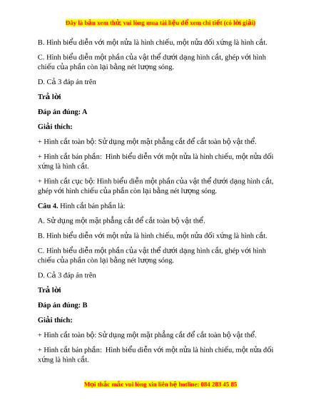 Đây là bản xem th , vu ử i lòng mua tài li u ệ đ xe ể m chi ti t (c ế ó l i ờ gi i ả ) B. Hình bi u di ể n v ễ i ớ m t ộ n a l ử à hình chi u, ế m t ộ n a đ ử i ố x ng l ứ à hình c t ắ . C. Hình bi u di ể n m ễ t ộ ph n c ầ a v ủ t ậ th d ể ư i ớ d ng ạ hình c t ắ , ghép v i ớ hình chi u ế c a ph ủ ần còn l i ạ b ng ằ nét lư ng s ợ óng. D. C 3 đáp án ả trên Trả l i ờ Đáp án đúng: A Giải thích: + Hình c t ắ toàn b : ộ S d ử ng m ụ t ộ m t ặ ph ng c ẳ t ắ đ c ể t ắ toàn b v ộ t ậ th . ể + Hình c t ắ bán ph n: ầ Hình bi u di ể n v ễ i ớ m t ộ n a l ử à hình chi u, ế m t ộ n a đ ử i ố x ng l ứ à hình c t ắ . + Hình c t ắ c c b ụ : ộ Hình bi u ể di n ễ m t ộ ph n c ầ a ủ v t ậ th d ể ư i ớ d ng hì ạ nh c t ắ , ghép v i ớ hình chi u c ế a ph ủ ần còn l i ạ b ng nét ằ lư ng s ợ óng. Câu 4. Hình c t ắ bán phần là: A. S d ử ng ụ m t ộ m t ặ ph ng c ẳ t ắ đ c ể t ắ toàn b v ộ t ậ th . ể B. Hình bi u di ể n v ễ i ớ m t ộ n a l ử à hình chi u, ế m t ộ n a đ ử i ố x ng l ứ à hình c t ắ . C. Hình bi u di ể n m ễ t ộ ph n c ầ a v ủ t ậ th d ể ư i ớ d ng ạ hình c t ắ , ghép v i ớ hình chi u ế c a ph ủ ần còn l i ạ b ng ằ nét lư ng s ợ óng. D. C 3 đáp án ả trên Trả l i ờ Đáp án đúng: B Giải thích: + Hình c t ắ toàn b : ộ S d ử ng m ụ t ộ m t ặ ph ng c ẳ t ắ đ c ể t ắ toàn b v ộ t ậ th . ể + Hình c t ắ bán ph n: ầ Hình bi u di ể n v ễ i ớ m t ộ n a l ử à hình chi u, ế m t ộ n a đ ử i ố x ng l ứ à hình c t ắ . M i
