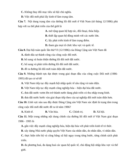 Câu 11. Một trong những nội dung chính của đường lối đổi mới ở Việt Nam giai đoạn 1986 - 1995 là
