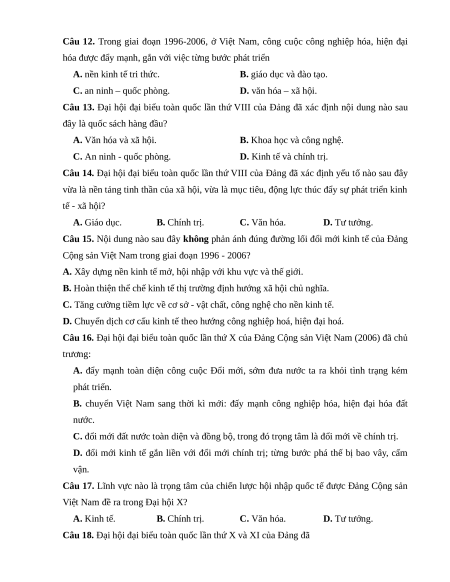 Câu 18. Đại hội đại biểu toàn quốc lần thứ X và XI của Đảng đã