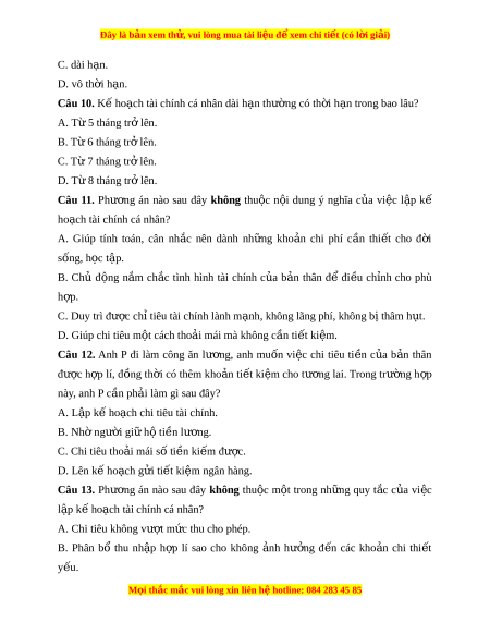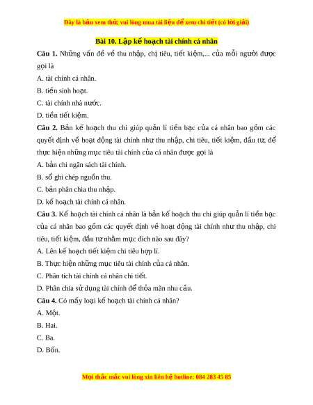 Đây là bản xem th , vu ử i lòng mua tài li u ệ đ xe ể m chi ti t (c ế ó l i ờ gi i ả ) Bài 10. Lập k h ế o ch t ạ ài chính cá nhân Câu 1. Nh ng ữ v n ấ đề về thu nh p, ậ chị tiêu, ti t ế ki m ệ ,... c a ủ m i ỗ ngư i ờ đư c ợ g i ọ là A. tài chính cá nhân. B. ti n s ề inh ho t ạ . C. tài chính nhà nư c. ớ D. ti n t ề i t ế ki m ệ . Câu 2. B n ả kế ho ch ạ thu chi giúp qu n ả lí ti n ề b c ạ c a ủ cá nhân bao g m ồ các quy t ế đ nh ị về ho t ạ đ ng ộ tài chính như thu nh p, ậ chi tiêu, ti t ế ki m ệ , đ u ầ t , ư để th c ự hi n nh ệ ng m ữ c ụ tiêu tài chính c a cá ủ nhân đư c g ợ i ọ là A. b n
