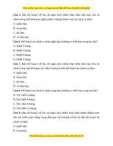 ạ về thu chi ngân sách nh m ằ th c ự hi n ệ m t ộ m c ụ tiêu tài chính trong m t ộ th i ờ gian ng n ắ (dư i ớ 3 tháng) thu c ộ lo i ạ tài chính cá nhân A. ng n ắ h n. ạ B. trung h n. ạ C. dài h n. ạ D. vô th i ờ h n. ạ Câu 6. Kế ho ch t ạ ài chính cá nhân ng n h ắ n ạ thư ng có t ờ h i ờ h n ạ trong bao lâu? A. Dư i ớ 2 tháng. B. Dư i ớ 3 tháng. C. Dư i ớ 4 tháng. D. Dư i ớ 5 tháng. Câu 7. B n ả kế ho ch