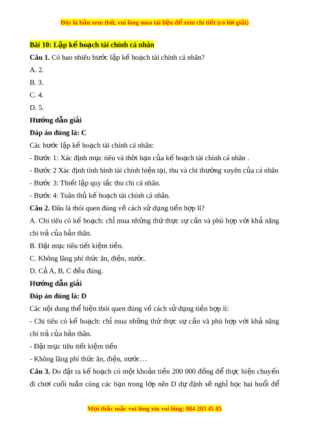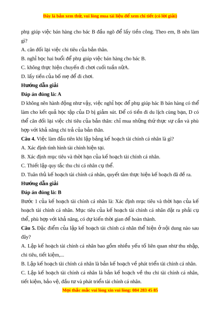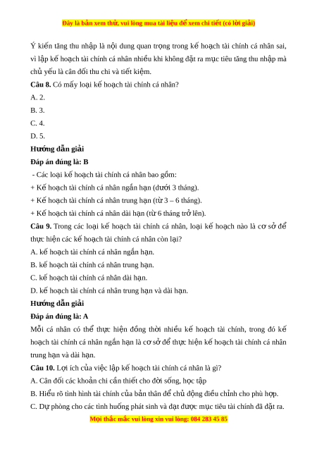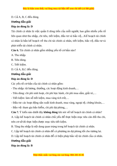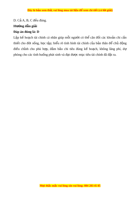 Đây là bản xem th , vu ử i lòng mua tài li u ệ đ xe ể m chi ti t ế (có l i ờ gi i ả ) D. C ả A, B, C đ u ề đúng. Hư ng d ớ ẫn gi i ả Đáp án đúng là: D Tài chính cá nhân là vi c ệ qu n ả lí dòng ti n ề c a ủ m i ỗ ngư i ờ , bao g m ồ nhi u ề y u ế tố liên quan như thu nh p, ậ chi tiêu, ti t ế ki m ệ , đ u ầ t ư và b o ả v ,...K ệ ế ho ch ạ tài chính cá nhân là b n ả kế ho ch ạ v