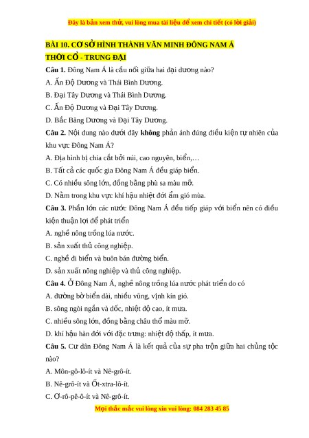 Câu 1. Đông Nam Á là c u n ầ i ố gi a hai ữ đ i ạ dư ng ơ nào? A. n Đ Ấ D ộ ư ng ơ và Thái Bình Dư ng. ơ B. Đ i ạ Tây Dư ng và ơ Thái Bình Dư ng. ơ C. n Đ Ấ ộ Dư ng và Đ ơ i ạ Tây Dư ng. ơ D. B c ắ Băng Dư ng và Đ ơ i ạ Tây Dư ng. ơ Câu 2. N i ộ dung nào dư i ớ đây không ph n ả ánh đúng đi u ề ki n ệ t ự nhiên c a ủ khu v c Đ ự ông Nam Á? A. Địa hình bị chia c t ắ b i