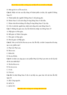 ố gia Chăm-pa, Cam-pu-chia,… đã sáng t o ạ ra chữ vi t ế riêng trên cơ s t ở i p t ế hu A. ch H ữ án c a ủ Trung Quốc. B. chữ Ph n ạ c a ủ n Đ Ấ . ộ C. chữ La-tinh c a L ủ a Mã. D. ch hì ữ nh nêm c a ủ Lư ng ỡ Hà. Câu 15. Tác ph m ẩ văn h c ọ nào c a ủ n Ấ Độ có nh ả hư ng ở sâu r ng ộ t i ạ khu v c Đ ự ông Nam Á? A. S t ử hi Đăm-săn. B. V k ở ịch - Ơ đíp làm vua. M i