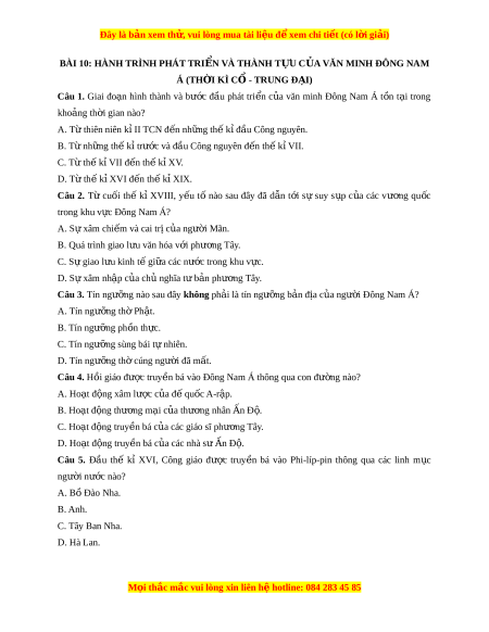 Câu 6. N i dung nào sau đâyộ không ph n ánh đúng tình hình tôn giáo Đông Nam Á th i kìả ở ờ