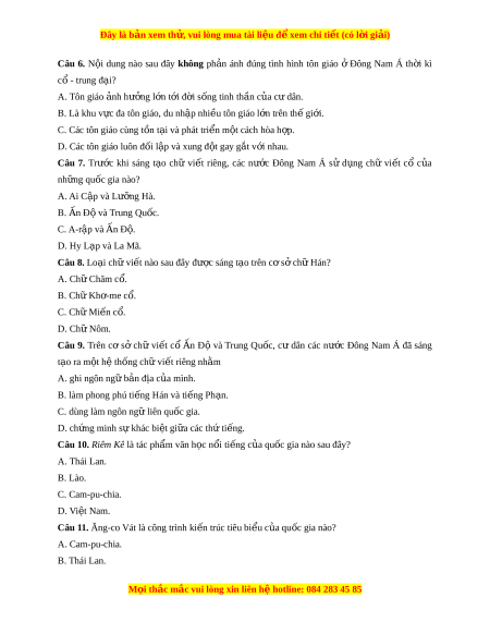 Câu 7. Trước khi sáng t o ạ chữ vi t ế riêng, các nư c ớ Đông Nam Á sử d ng ụ chữ vi t ế cổ c a ủ nh ng ữ qu c ố gia nào? A. Ai Cập và Lư ng H ỡ à. B. Ấn Đ và ộ Trung Qu c ố . C. A-rập và Ấn Đ . ộ D. Hy Lạp và La Mã.