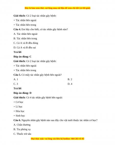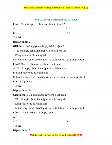 Câu 1. Có mấy nguyên nhân gây bệnh ở vật nuôi? A. 1 B. 2 C. 3 D. 4 Trả lời Đáp án đúng: C