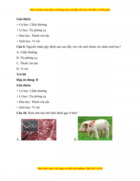 Câu 9. Nguyên nhân gây bệnh nào sau đây cho vật nuôi thuộc tác nhân sinh học? A. Chấn thương B. Tia phóng xạ C. Thuốc trừ sâu D. Vi rút Trả lời Đáp án đúng: D Giải thích: + Cơ học: Chấn thương + Lí học: Tia phóng xạ