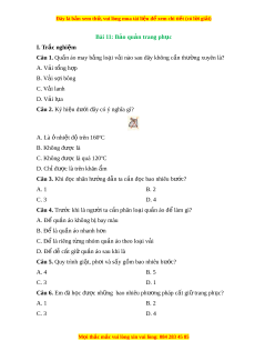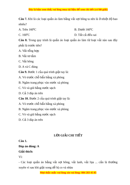 Câu 8. Trong quy trình là qu n ầ áo lo i ạ qu n ầ áo làm từ lo i ạ v i ả nào sau đây ph i ả là trư c t ớ iên? A. V i ả tổng h p ợ B. V i ả t t ơ m ằ C. V i ả bông D. A và C đúng Câu 9. Bư c ớ 1 c a quá t ủ rình gi t ặ tay là: A. Vò trư c ớ chỗ b n b ẩ ng ằ xà phòng B. Ngâm trang ph c vào ụ nư c xà phòng ớ C. Vò và giũ b ng n ằ ư c ớ sạch D. Cả 3 đáp án trên Câu 10. Bư c ớ 2 c a quá t ủ rình gi t ặ tay là: A. Vò trư c ớ chỗ b n b ẩ ng ằ xà phòng B. Ngâm trang ph c vào ụ nư c xà phòng ớ C. Vò và giũ b ng n ằ ư c ớ sạch D. Cả 3 đáp án trên L I Ờ GIẢI CHI TI T Ế Câu 1. Đáp án đúng: A Giải thích: Vì: - Các lo i ạ qu n ầ áo b ng ằ v i ả s i ợ bông, v i ả lanh, v i ả l a ụ ... c n ầ là thư ng ờ xuyên vì sau khi gi t ặ xong d b ễ co và nhàu ị M i