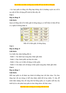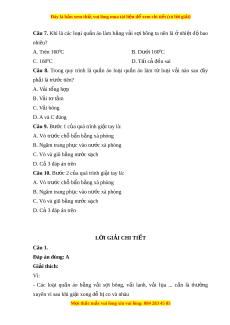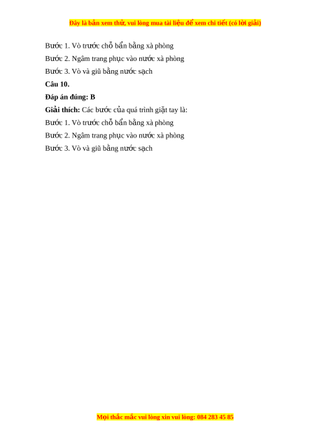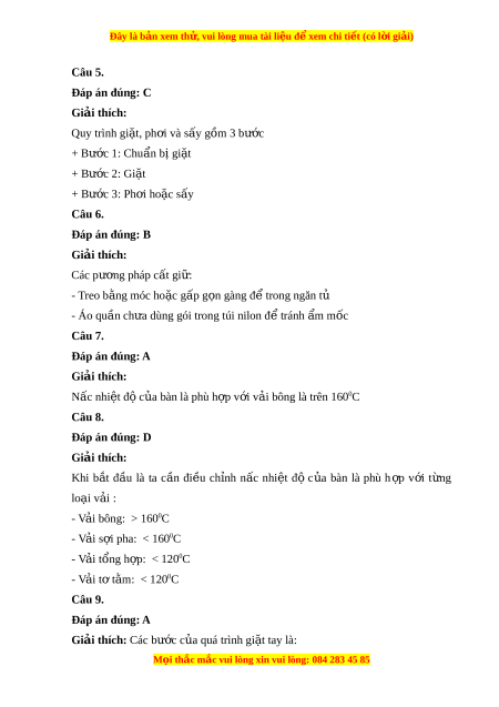 Đây là bản xem th , vu ử i lòng mua tài li u ệ đ xe ể m chi ti t ế (có l i ờ gi i ả ) Câu 5. Đáp án đúng: C Giải thích: Quy trình gi t ặ , ph i ơ và s y g ấ m ồ 3 bư c ớ + Bư c ớ 1: Chuẩn bị gi t ặ + Bư c ớ 2: Gi t ặ + Bư c ớ 3: Ph i ơ ho c s ặ y ấ Câu 6. Đáp án đúng: B Giải thích: Các pư ng pháp c ơ t ấ gi : ữ - Treo b ng ằ móc ho c g ặ p g ấ n gàng ọ đ t ể rong ngăn tủ - Áo quần ch a