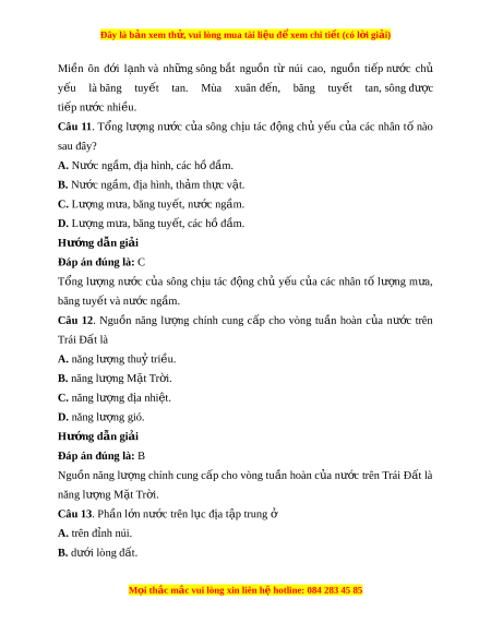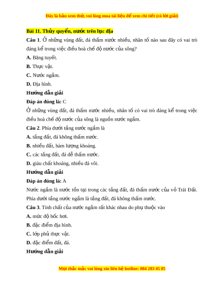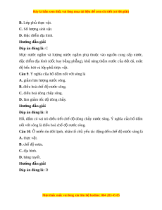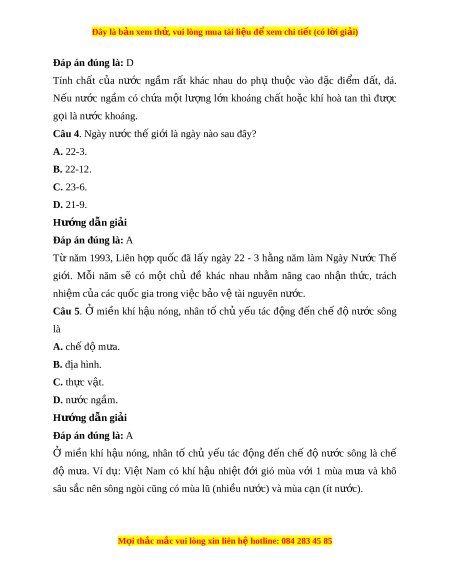 Đây là bản xem th , vu ử i lòng mua tài li u ệ đ xe ể m chi ti t (c ế ó l i ờ gi i ả ) Đáp án đúng là: D Tính ch t ấ c a ủ nư c ớ ng m ầ r t ấ khác nhau do phụ thu c ộ vào đ c ặ đi m ể đ t ấ , đá. N u ế nư c ớ ng m ầ có ch a ứ m t ộ lư ng ợ l n ớ khoáng ch t ấ ho c ặ khí hoà tan thì đư c ợ g i ọ là nư c khoáng. ớ Câu 4. Ngày nư c t ớ h gi ế i ớ là ngày nào sau đây? A. 22-3. B. 22-12. C. 23-6. D. 21-9. Hư ng d ớ ẫn gi i ả Đáp án đúng là: A Từ năm 1993, Liên h p ợ qu c ố đã l y ấ ngày 22 - 3 h ng ằ năm làm Ngày Nư c ớ Thế gi i ớ . Mỗi năm sẽ có m t