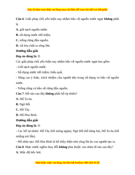 Đây là bản xem th , vu ử i lòng mua tài li u ệ đ xe ể m chi ti t (c ế ó l i ờ gi i ả ) Câu 6. Gi i ả pháp chủ y u ế hi n ệ nay nh m ằ b o ả v ệ ngu n ồ nư c ớ ng t ọ không ph i ả là A. gi s ữ ch ạ nguồn nư c. ớ B. s d ử ng ụ nư c t ớ i t ế ki m ệ . C. trồng r ng đ ừ ầu nguồn.