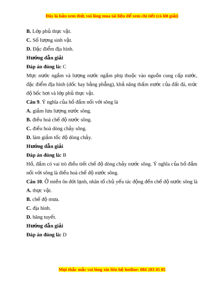 Đây là bản xem th , vu ử i lòng mua tài li u ệ đ xe ể m chi ti t (c ế ó l i ờ gi i ả ) B. L p ph ớ t ủ h c v ự t ậ . C. Số lư ng s ợ inh v t ậ . D. Đặc đi m ể địa hình. Hư ng d ớ ẫn gi i ả Đáp án đúng là: C Mực nư c ớ ng m ầ và lư ng ợ nư c ớ ng m ầ phụ thu c ộ vào ngu n ồ cung c p ấ nư c, ớ đ c ặ đi m ể đ a ị hình (d c ố hay b ng ằ ph ng) ẳ , kh ả năng th m ấ nư c ớ c a ủ đ t ấ đá, m c ứ độ bốc h i ơ và l p ph ớ t ủ h c v ự t ậ . Câu 9. Ý nghĩa c a ủ hồ đ m ầ n i ố v i ớ sông là A. gi m ả l u l ư ư ng n ợ ư c ớ sông. B. đi u hoà ch ề đ ế ộ nư c s ớ ông. C. đi u hoà ề dòng ch y s ả ông. D. làm gi m ả tốc độ dòng ch y ả . Hư ng d ớ ẫn gi i ả Đáp án đúng là: B Hồ, đ m ầ có vai trò đi u ề ti t ế ch ế đ ộ dòng ch y ả nư c ớ sông. Ý nghĩa c a ủ h ồ đ m ầ nối v i ớ sông là đi u hoà ch ề đ ế n ộ ước sông.