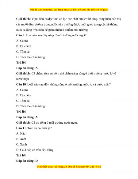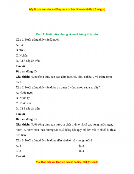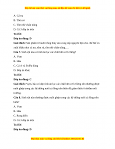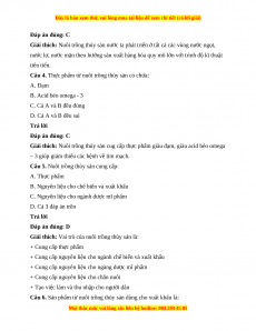Câu 2. Nuôi trồng thủy sản được áp dụng ở vùng nước nào sau đây? A. Nước ngọt B. Nước lợ C. Nước mặn D. Cả 3 đáp án trên Trả lời Đáp án đúng: D
