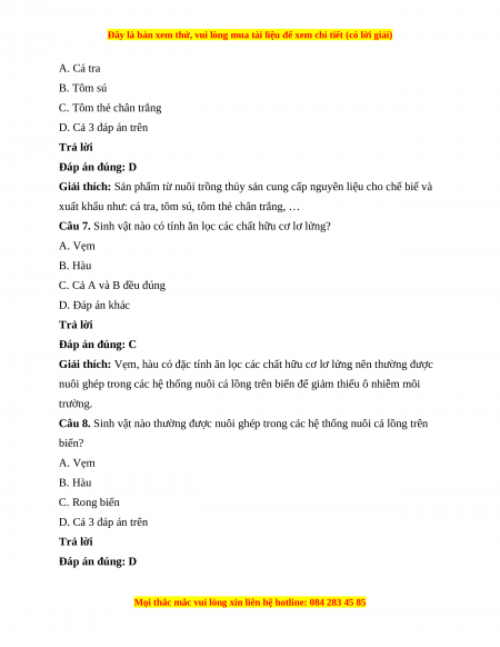 Câu 8. Sinh vật nào thường được nuôi ghép trong các hệ thống nuôi cá lồng trên biển? A. Vẹm B. Hàu C. Rong biển D. Cả 3 đáp án trên Trả lời Đáp án đúng: D