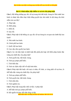 ể và vai trò c a pháp l ủ u t ậ Câu 1. Hệ th ng ố nh ng ữ quy t c ắ x ử s ự mang tính b t ắ bu c ộ chung do Nhà nư c ớ ban hành và đư c ợ b o ả đ m ả th c ự hi n ệ b ng ằ quy n ề l c ự nhà nư c ớ là n i ộ dung c a ủ khái niệm nào sau đây? A. Pháp lu t ậ . B. Hi n pháp. ế C. Đi u l ề . ệ D. Quy tắc. Câu 2. Pháp lu t ậ là h ệ th ng ố các quy t c ắ x s ử chung ự do c ơ quan nào dư i ớ đây ban hành? A. Nhà nư c ban hành. ớ B. Chính ph ban hành. ủ C. Quốc h i ộ ban hành. D. Giai c p c ấ m ầ quy n ban ề hành. Câu 3. Các văn b n ả lu t ậ và dư i ớ lu t ậ đ u ề ph i ả phù h p ợ v i ớ Hi n ế pháp thu c ộ đ c ặ tr ng nào d ư ư i ớ đây c a pháp l ủ u t ậ ? A. Tính quy n l ề c, ự b t ắ bu c ộ chung. B. Tính quy ph m ạ ph bi ổ n. ế C. Tính hi n đ ệ i ạ . D. Tính xác đ nh ch ị t ặ ch v ẽ m ề t ặ hình th c. ứ Câu 4. Pháp lu t ậ b t ắ bu c ộ v i ớ m i ọ cá nhân, tổ ch c, ứ ai cũng ph i ả xử sự theo, là th hi ể n đ ệ c ặ tr ng nào ư dư i ớ đây c a ủ pháp lu t ậ ? A. Tính quy ph m ạ phổ bi n. ế B. Tính quy n l ề c, b ự t ắ bu c ộ chung. C. Tính nhân dân. D. Tính nghiêm túc. Câu 5. Pháp lu t ậ mang b n ch ả t ấ xã h i ộ , vì pháp lu t ậ A. th hi ể n t ệ ính quy ph m ạ ph bi ổ n. ế B. b t ắ nguồn t t ừ h c t ự i n đ ễ i ờ s ng xã ố h i ộ . M i ọ thắc m c